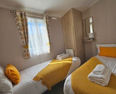 Bedroom two has twin beds, positioned in a way that allows for a more spacious feel. There is also a wardrobe for storage.